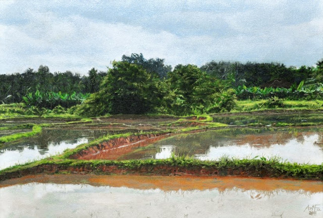 | Yet Another Amazing Art by Arifa: Field “ പാടം ”: കഴിഞ്ഞ അവധിക്കാലത്ത് നാട്ടില് പോയപ്പോള് അനുജത്തി പകര്ത്തിയ ഒരു പടമാണ് ഈ പെയിന്റിംഗിന് എനിക്ക് സഹായകമായത ്, ഉമ്മയുടെ വീട്ടില് …(The above picture created by Arifa, it is based upon a picture captured by her younger sister Jumaana in the recent visit to Kerala (@ their mother’s home) on a vacation.) |