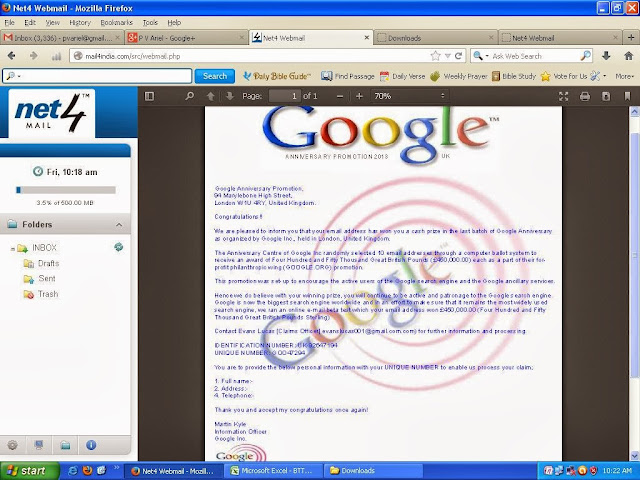 We are pleased to inform you that your email address won you a cash prize in the last batch of Google Anniversary organized by Google Inc. held in London, United Kingdom……… to continue reading please expand (Ctrl+) the above screenshot.