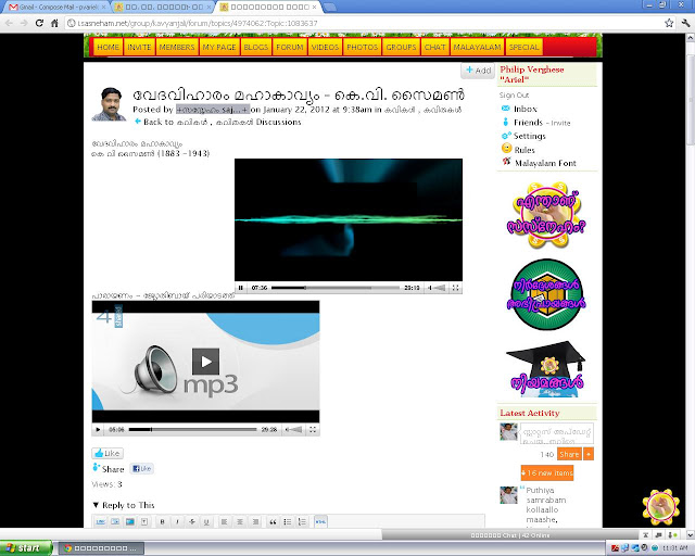 ഞാനàµâ€ സസàµà´¨àµ‡à´¹à´‚ സൈറàµà´±à´¿à´²àµâ€ പോയി à´ˆ കവിതാപാരായണം കേടàµà´Ÿàµ. ഇതൠആലാപനം à´œàµà´¯àµ‹à´¤à´¿à´¬à´¾à´¯àµ പരിയാടതàµà´¤àµ à´…à´²àµà´²à´²àµà´²àµ‹. പെരàµà´®àµà´ªà´¾à´µàµ‚à´°àµâ€ ജി രവീനàµà´¦àµà´°à´¨à´¾à´¥àµà´‚ പാലാ ഉഷാകàµà´®à´¾à´°à´¿à´¯àµà´‚ സംഗീതം നിരàµâ€à´µà´¹à´¿à´šàµà´šàµ à´¶àµà´°àµ€à´®à´¨àµà´¦à´¿à´°à´‚ രാജലകàµà´·àµà´®à´¿ ആലപിചàµà´šà´¤à´¾à´£à´¿à´¤àµ. യൂ à´Ÿàµà´¯àµ‚ബിലàµâ€ ഇതിനàµà´±àµ† വീഡിയോ കാണാം http://www.youtube.com/watch?v=DP2yilORJ6E മാതàµà´°à´®à´²àµà´², à´œàµà´¯àµ‹à´¤à´¿à´¬à´¾à´¯àµ പരിയാടതàµà´¤à´¿à´¨àµà´±àµ† à´¬àµà´²àµ‹à´—ൠസൈറàµà´±à´¿à´²àµâ€ പോയി അവരàµà´Ÿàµ† ആലാപനവàµà´‚ ഞാനàµâ€ കേടàµà´Ÿàµ. അതിനെകàµà´•ാളàµâ€ à´à´±àµ†à´¯à´¿à´·àµà´Ÿà´‚ തോനàµà´¨à´¿à´¯à´¤àµ à´¶àµà´°àµ€à´®à´¨àµà´¦à´¿à´°à´‚ രാജലകàµà´·àµà´®à´¿à´¯àµà´Ÿàµ† ആണെനàµà´¨àµ ഒരൠആസàµà´µà´¾à´¦à´•നെനàµà´¨ നിലയിലàµâ€ എനികàµà´•ൠതോനàµà´¨àµà´¨àµà´¨àµ.